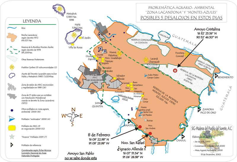 Entre el 15 y el 16 de diciembre se procedería al desalojo de ocho poblados en la zona sur de la reserva de la biosfera de Montes Azules, Chiapas -cinco de los cuales están habitados por bases del Ejército Zapatista de Liberación Nacional (EZLN)- y un rancho privado, en un operativo conjunto con la intervención de militares, elementos de la Policía Federal Preventiva (PFP), policías estatales, así como elementos de la Procuraduría Federal de Protección al Ambiente (Profepa) y la Comisión Nacional de Areas Naturales Protegidas, denunció el vocero de Maderas del Pueblo del Sureste, Luis Miguel Robles Gil.